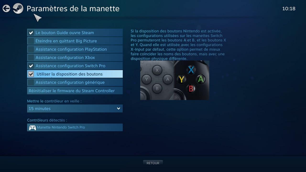 Avec Steam, les choses vont plus vite : le logiciel reconnaît le Pro Controller sans manipulation spéciale. L’ensemble de la ludothèque se laisse piloter, et il est possible d’ajuster librement la configuration des touches. Voici la marche à suivre :