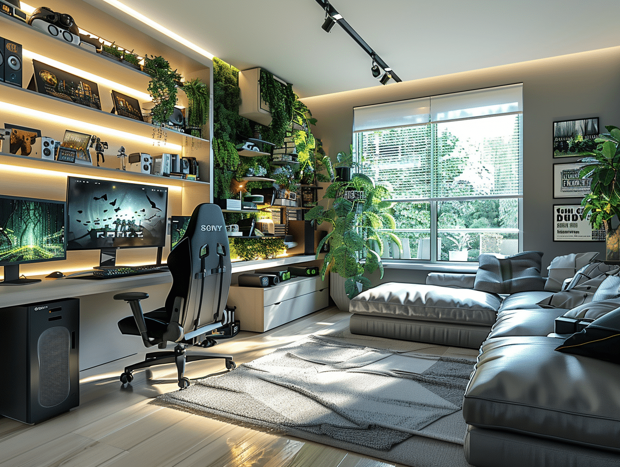 L’aménagement intérieur doit refléter votre personnalité tout en restant fonctionnel. Un meuble TV lumineux ou une vitrine pour gamer permettent de mettre en valeur vos consoles et objets collectors. Pensez à des solutions de rangement intégrées dans le mobilier pour éviter tout encombrement. Un tapis du salon, des rideaux thématiques et un confortable canapé en tissu ou en cuir créent un espace détente pour les moments de pause.