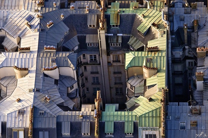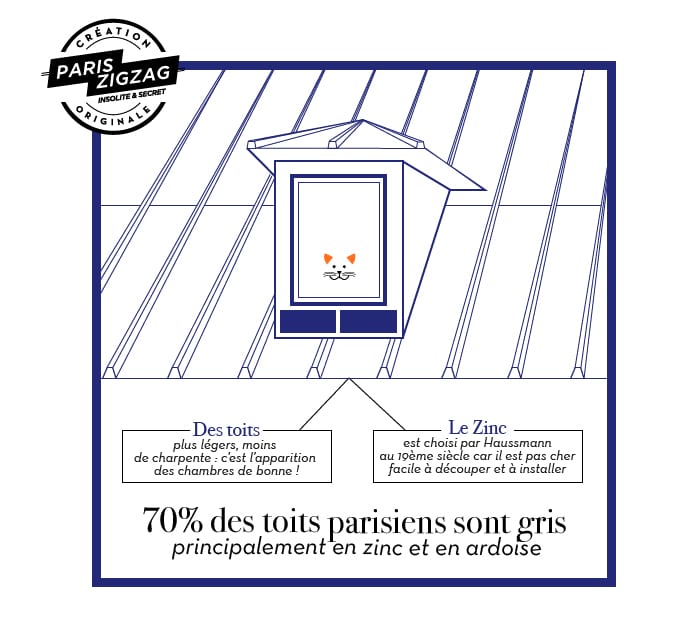Sous les toits gris, une vie nouvelle s’installe Zinc (gris clair) et ardoise (gris foncé) cohabitent sur les sommets parisiens. Les toits verts, eux, révèlent la présence du cuivre. Xavier D’ABRIGEON