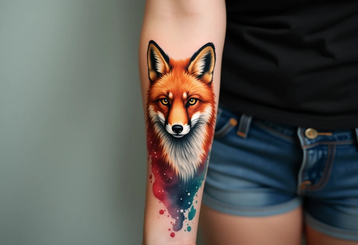 Le tatouage aquarelle, avec ses couleurs vives et ses contours flous, offre une interprétation artistique du renard. Ce style met en avant la créativité et la nature sauvage de l’animal.